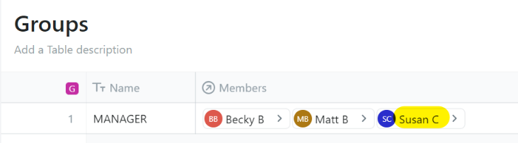Here you can see that “Susan C” is a member of the “MANAGER” group: