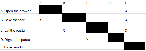 Below is a very simple and silly example of a database “Steps to eat pasta”, where we’re mapping the relationship “depends on” with “X”. We can read it by, for example, looking at the second row of the first line; B depends on A. This representation could be used for any “intra-database” relationship and could even map several at once.