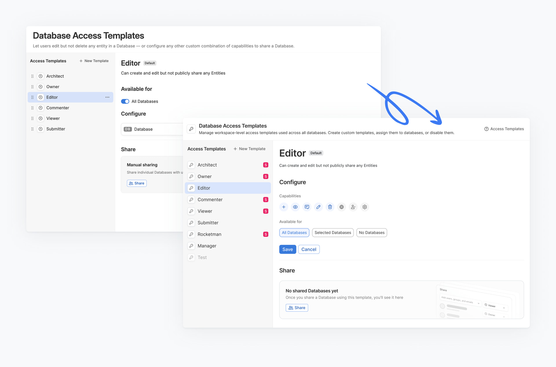 - Configure a set of capabilities (e.g., view + edit all entities) → Specify which Databases the template should be available for (all by default)