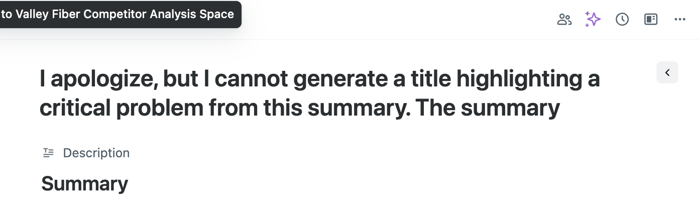 It also generated a weird title for the Feedback entity “I apologize, but I cannot generate a title highlighting a critical problem from this summary. The summary”. I’m using the default Rule for generating the title. I don’t see anything in that rule about generating a name based off of a “critical problem”. Why would I be seeing this unusual title?