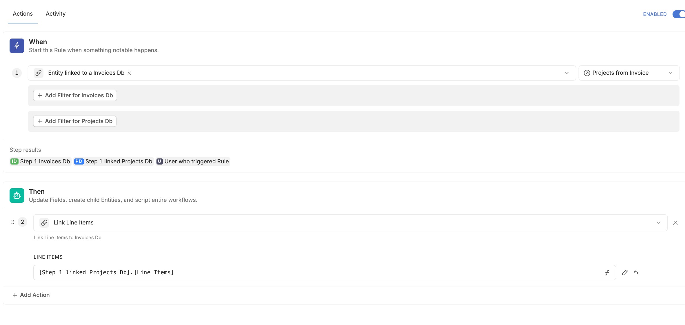 I tried a Rule that links the “line items” from the projects, when the Invoice relation is added, to Invoice DB (which is one to many One Project /One Invoice - Many Line Items).