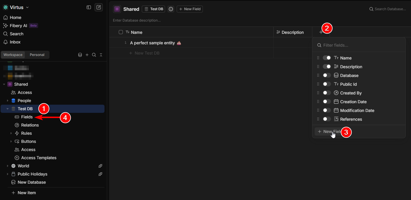 The popup (2) you see when you click on the “+” is now different; it suggests showing existing fields, but lets you add a new at the bottom (3). Once clicked, you see the same popup as in the video.