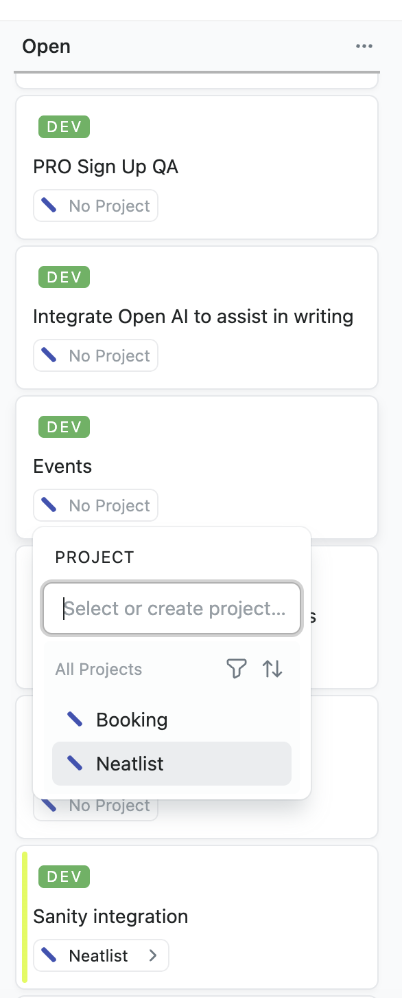- Assign Events to Neatlist (project) see in the screenshot that Sanity was previously assigned