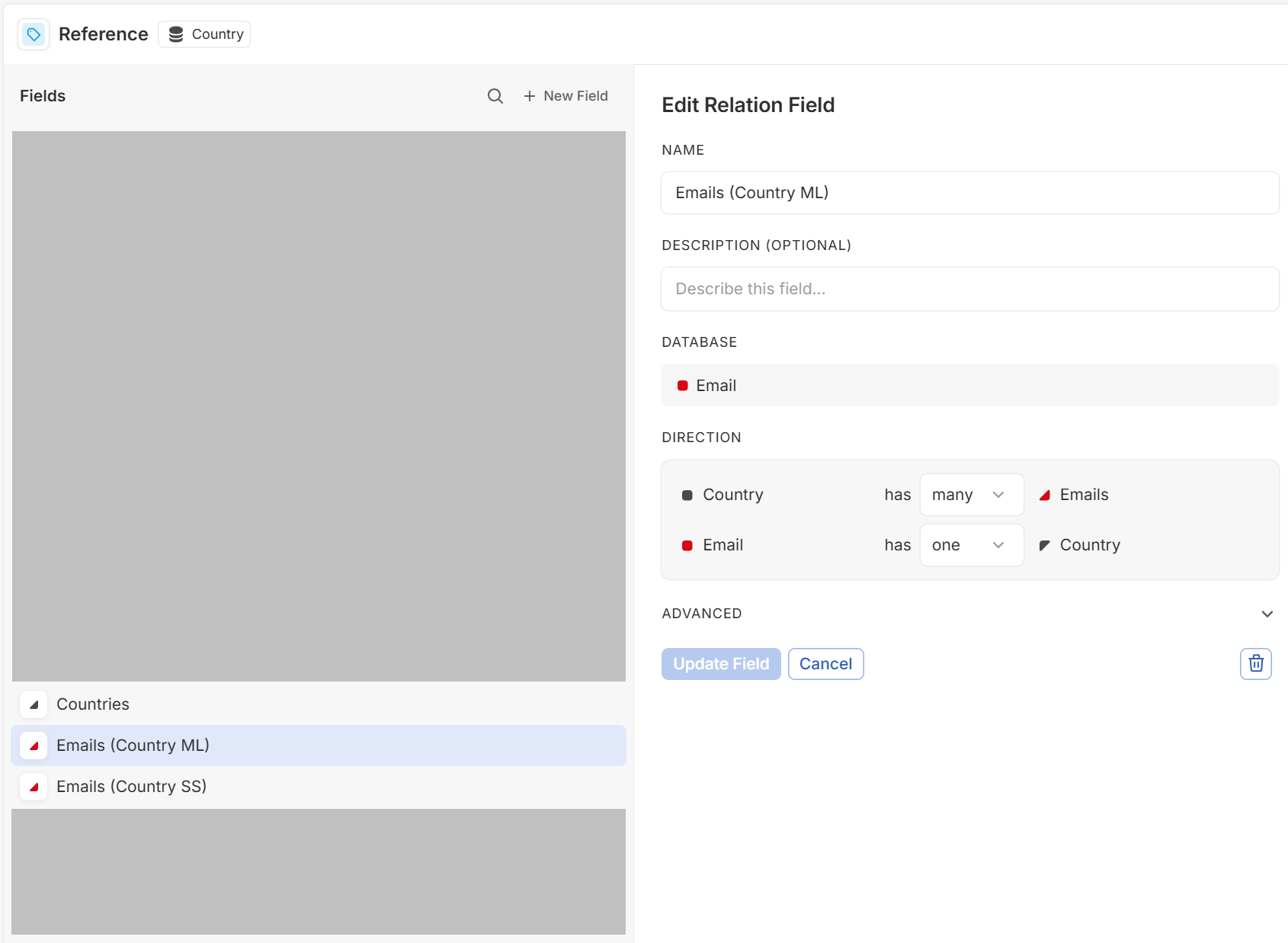 See below. The Email entity has three different relations to the same Country entity. But the field definition doesn’t show what related field name is on the Country side of the relationship, and vice versa. In the screenshot, it is unclear that the field Country ML (in Email) is mapped onto Emails (Country ML) in Country.